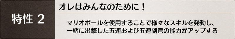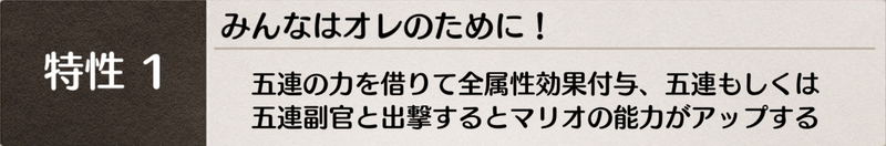 ソロバトルを除いた全てのバトルでマリオと一緒に編成した五連・副官キャラの能力がアップする。五連・副官キャラの能力アップについては『相性特性』参照。