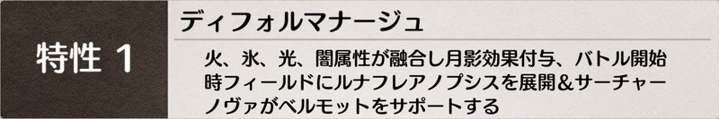 | 【補足】 月齢が『新月』の場合は効果なし ルナフレアノプシスの月齢効果の詳細は特性2『ノクターナル・ファレノプシス』参照 |