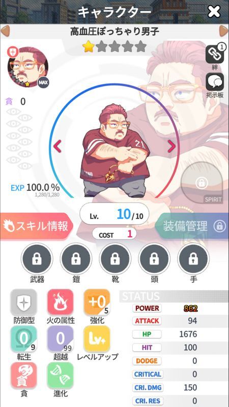 | 絆キャラクターの攻撃力が16%増加、絆アクティブスキル発動 ぽっちゃり男子|(火)|[一般] + パク・グァンセ|(火)|[一般] + 洋ナシ乙女|(火)|[一般] + ギャル|(火)|[一般] + シン・サンチョル|(火)|[一般] | |