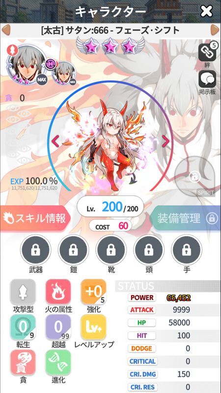 | 絆キャラクターの攻撃力15%が増加、HPが5%減少 サタン:666|(基本)|[太古] + パク・ムジン|(絶対神)|[太古] | |