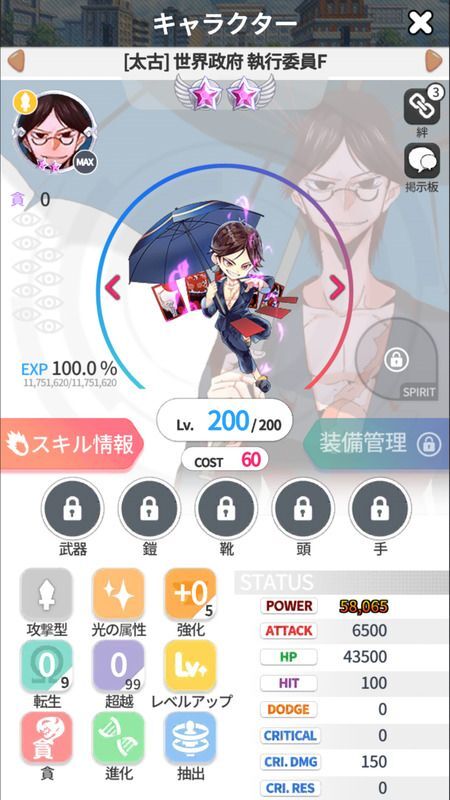 | 絆キャラクターの攻撃力が5%増加、絆アクティブスキル発動<全体ダメージ+50%の確率で気絶> ロシナンテ|(太古)|[太古] + 執行委員F|(基本)|[太古] | |