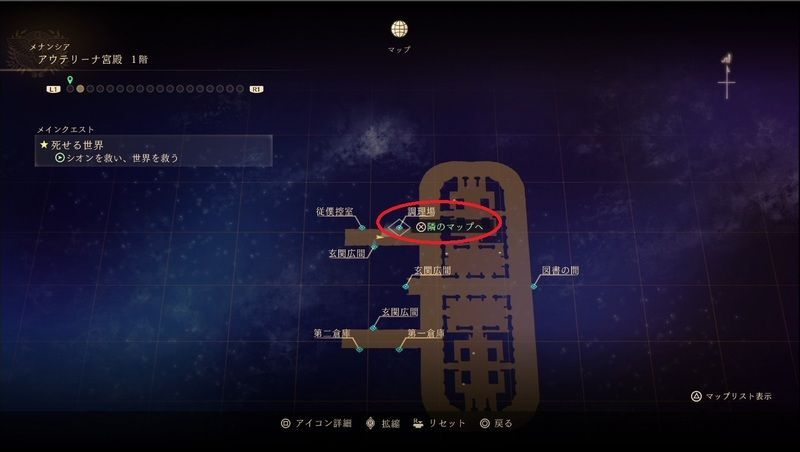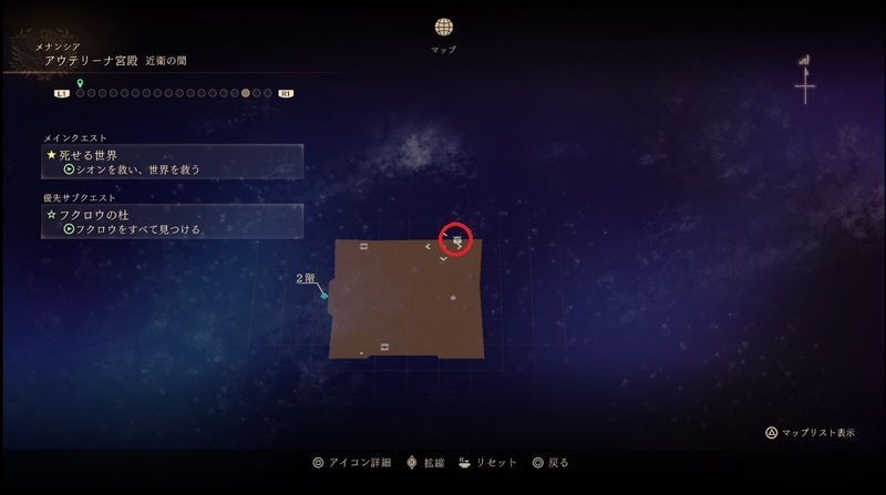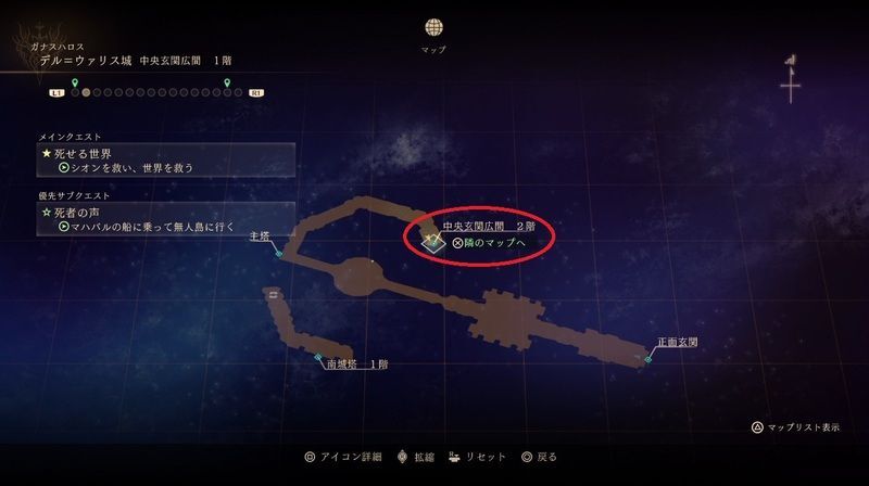 | リベールの獄塔1階玄関広間にファストトラベルし、2階に上がり大回りして右下の隅部屋 | |||