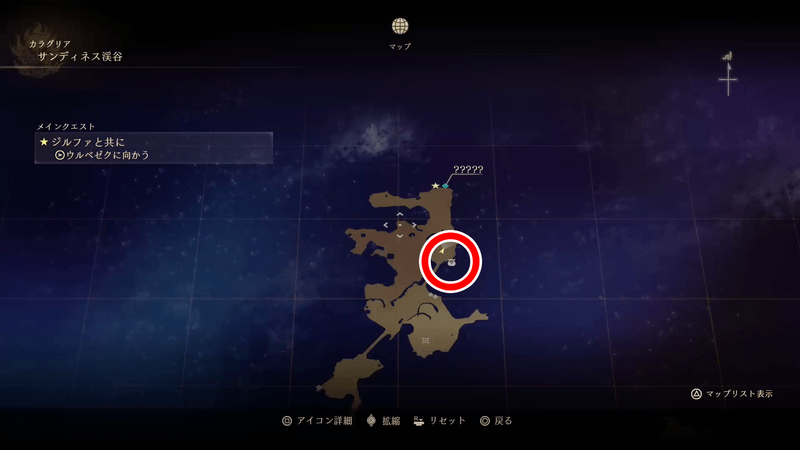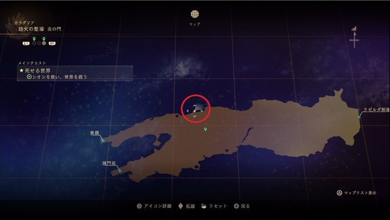 | 右下にファストトラベルして右上の細長い道に入る | |||