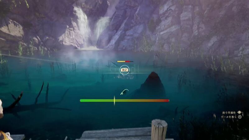 魚が近づくとルアーに食いつきます。画面に「R2」と表示されるため、制限時間までにR2を押しましょう。