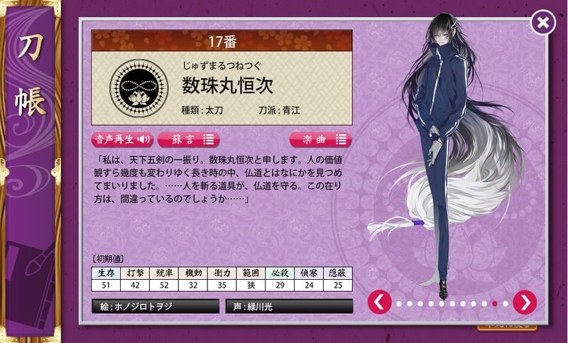 | 入手 | 「私は、数珠丸恒次と申します。人の価値観すら幾度と変わりゆく長き時の中、仏道とはなにかを見つめてまいりました」 |