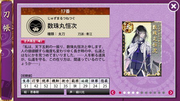 | 私は、天下五剣の一振り。数珠丸恒次と申します。 人の価値観すら幾度も変わりゆく長き時の中、仏道とはなにかを見つめてまいりました。……人を斬る道具が、仏道を守る。この在り方は、間違っているのでしょうか…… |