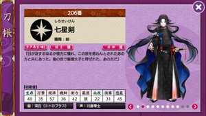 | 七星剣とは、刀身に北斗七星が刻まれた剣を指す。北天に輝く七つ星はすなわち死を司る神、北斗星君。災厄を祓い、あらゆる敵を打ち果たすという。その一口は聖徳太子佩用の伝承を持ち、安寧秩序を星に願う。 | |