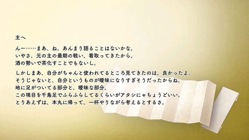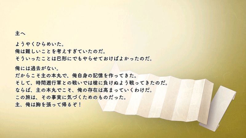 37年まえ ID:eif3k7cbいよいよ我が初期刀のまんばちゃんの旅立ちです。楽しみすぎる。まだ修行に出してない子もたくさんいるので、お手紙読めて嬉しいです。ありがとうございました。