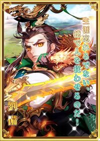 後漢末期から三国時代の武将、蜀漢の初代皇帝。字は玄徳。黄巾の乱の鎮圧で功績を挙げ、その後は各地を転戦した。諸葛亮の天下三分の計に基づいて益州の地を得て勢力を築き、後漢の滅亡を受けて皇帝に即位して、蜀漢を建国した。その後の、魏・呉・蜀漢による三国鼎立の時代を生じさせた。