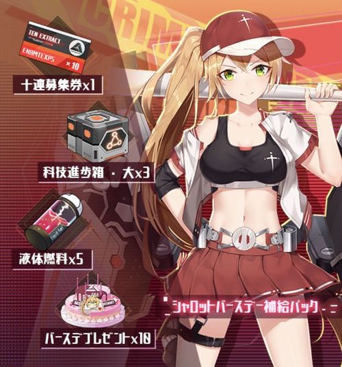 | パック内容 | ・十連募集券×1 ・科技進歩箱・大×3 ・液体燃料×5 ・バースデープレゼント×10 |