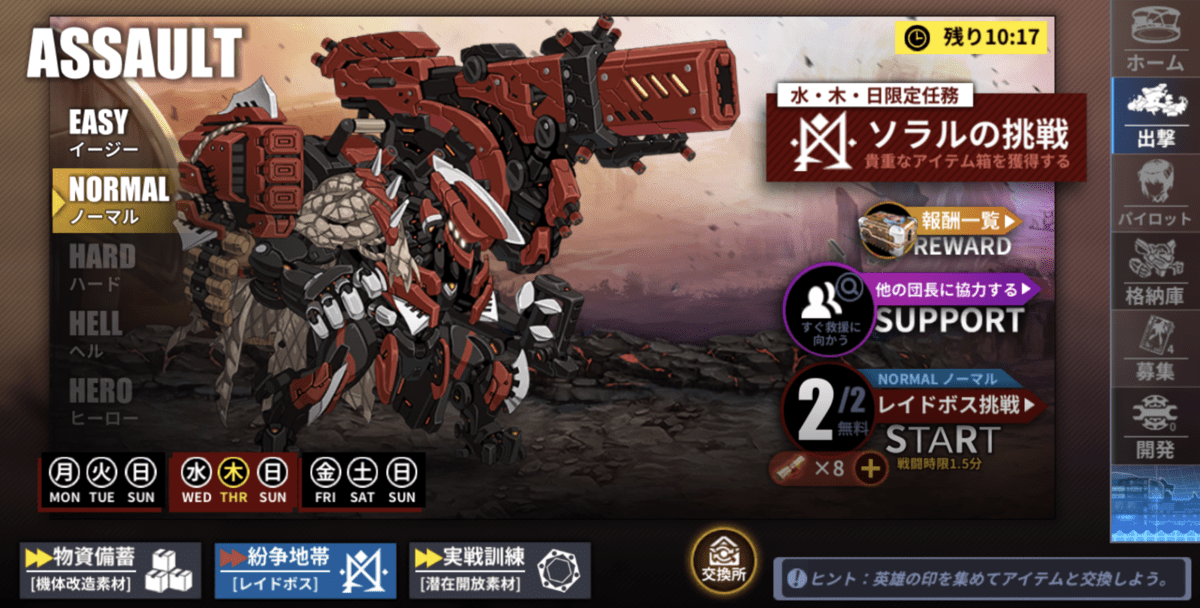 ゲームのメインであるメカについて語ったところで、本作のシステム面についても触れていきましょう。ファイナルギアは、非スタミナ制となっており、ステージによって1日に挑める回数が制限されています。