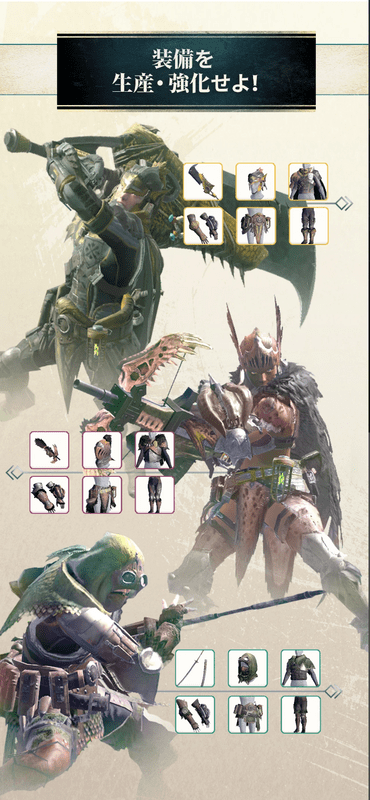 本作は、一人でプレイすることもできますが、最大4人のマルチプレイにも対応。マルチプレイでは、他のプレイヤーと協力して、強力なモンスターに挑むことができます。戦闘は画面スライドによる「回避」とタップによる「攻撃」の2アクションが基本。部位破壊といったモンハンお馴染みの概念も実装されているので、まずはモンスターの特徴を知ってみんなでワイワイ狩りにでかけましょう!