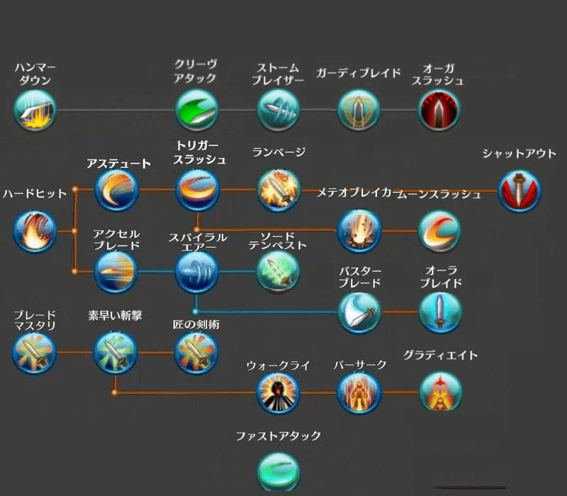 | 【片手剣】 ・バフを消費しなくなる ・スキル「バスターブレード」のバフを獲得した時、 オーラブレイドのバフを10秒延長する ・習得Lvに応じてバスターブレードの威力が増加 |