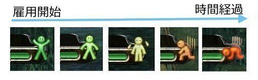 傭兵は、時間経過により疲労度が増加し、ステータスが減少していきます。