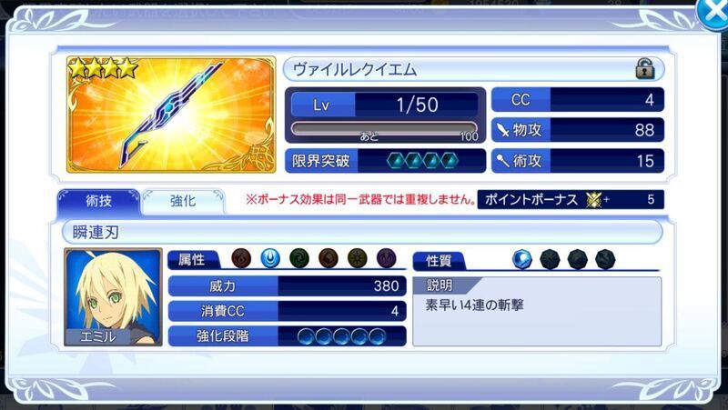 | ・余談だがエミルには原作で眷属に力を借りることで技内容が変化する特技が存在し、本作ではそれが採用されているものとそうでないものが存在する。瞬連刃は前者で、原作での変化前との差は氷属性(本作では水属性)の付与と最終ヒットと同時に発生する凍気の有無で原作では凍気部分に追加の攻撃判定があった。 | |