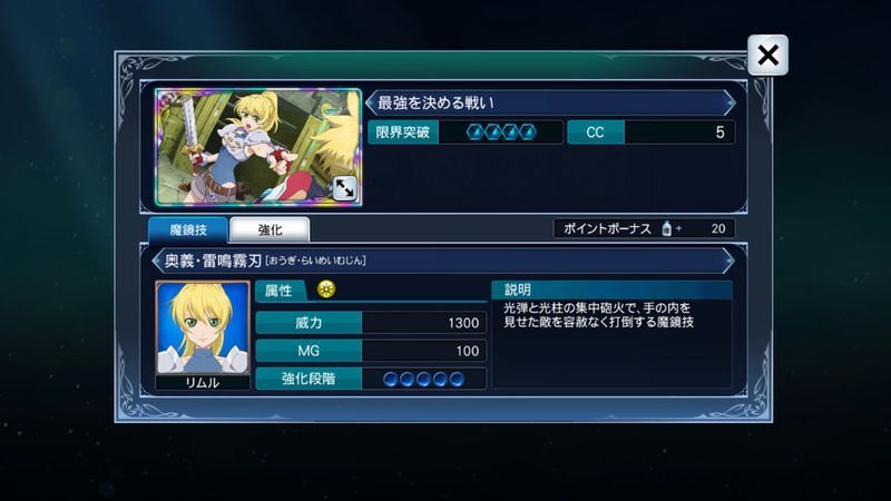 | 強化5 | 敵の魔鏡技の直後に発動時、威力30%上昇 |