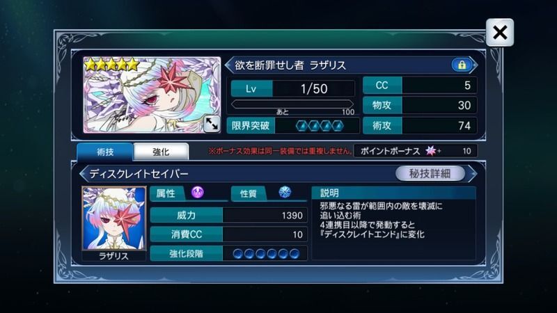 | 邪悪なる雷が範囲内の敵を壊滅に追い込む術 4連携目以降で発動すると『ディスクレイトエンド』に変化(消費CC20) | |