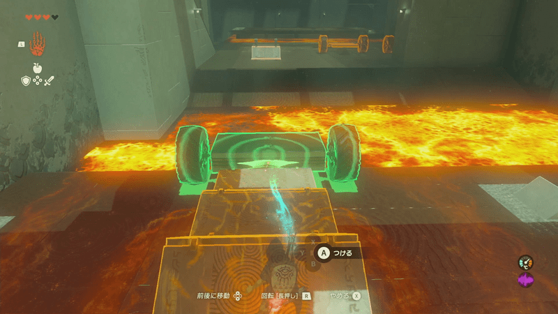 台車をくっつけたら、台車にのってタイヤ部分を叩くことで対岸まで渡り切ることができます。