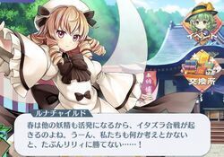 | 静かなる月の光こと、ルナチャイルドよ。君が『マジモンの神隠し』で幻想郷に来たって人間ね。聞いてはいたけれど、あまり里の人間と変わりなさそう……でも、君と一緒にいたら何か面白いことが起きるかも。だって皆、君のことを噂してるんだもの。私、音には敏感だからいろいろ聞いてるのよね。ふふっ、残念だけど、どんな噂かは内緒よ。 | |