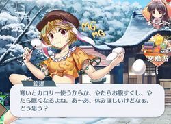| 元イーグルラヴィの鈴瑚ってんだ、よろしくね。今は、幻想郷で一番の団子屋をやってるのが自慢でね、良かったら食べに来てよ。ふ~ん、君のことは小耳に挟んだけど、想像通りイマイチ読めない感じだね。何か裏があるのか、ちょいとそそられるよ。調査に行くなら是非声をかけて。きっと役に立つだろうからさ。 | |
