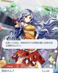 | うちは坂田ネムノ。あんたは何モンだ?……へぇ、ずいぶんとでっけぇ異変が起きて、苦労してるみてぇだな。複雑な事情はよく分かんねぇが、うちにも守りたいものの一つや二つある。山姥としての義理は通させてもらうべ。ただ、うちは人食いの妖怪だ。人間のあんたは、しっかりうちを恐れてくれ。でないと調子が狂うから、よろしく頼むべ。 | |
