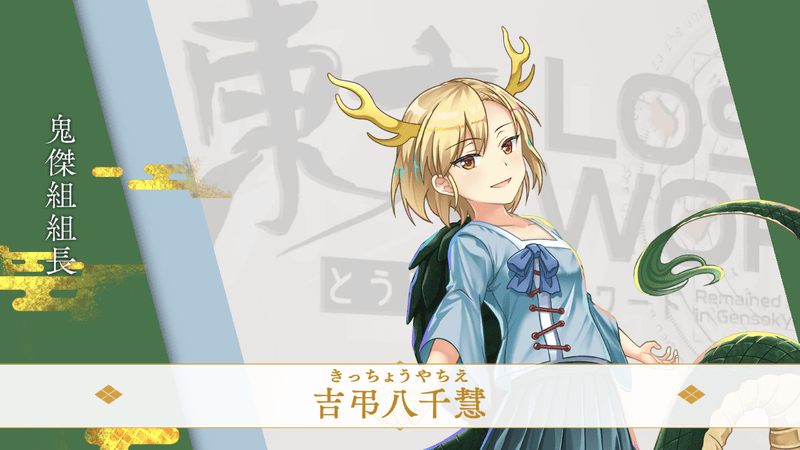 | ……やれやれ、こんな形で私を呼び出す方法があったとは。私は鬼傑組の組長、吉八千慧です。畜生界には私以外にも組織の長が存在しますが、この状況……殊に大異変に関して十分に理解できるのは、私くらいでしょう。貴方が普通の人間であっても、その点については賢い選択をしたと言えます。さて、まずは情報が必要ですね。お話を伺っても? | |