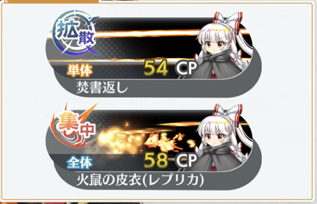 | 単体攻撃 【攻撃前】味方全体の陽防を2段階アップ(4T) 相手全体の陽防を2段階ダウン(2T) 相手単体のCRI防御を2段階ダウン(4T) 【攻撃】月属性必中弾性精密各種特攻ミサイル弾 【弾幕構成】陽気のみ 【ブースト追加】月属性吸収命中上昇各種特攻弾/月属性弾性精密弾/火属性吸収各種特攻弾/火属性弾性精密弾/火属性焼却氷解閃光各種特攻弾 【攻撃後】自身の結界異常を2枚回復[発生率50%で追加効果+1] | |