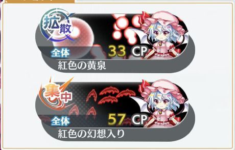 | 濃紅の幻想入り ×1 | 月属性/陰気/全体 光弾 命中率75% CRI率10% 最大10%吸収弾 人間&巫女&魔法使い特攻 威力:5.82 | 3 |