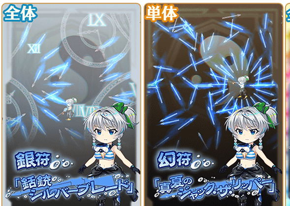 | 真夏の調達メイド ×2 | 金属性/陽気/単体 尖弾 命中率75% CRI率15% 精密弾 悪魔&夏&魔法使い&巫女&水着&水棲&吸血鬼特攻 威力:12.02 | |
