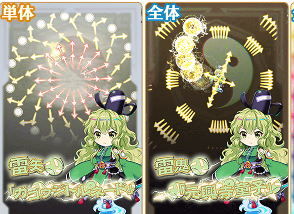 | 元興寺童子の落雷 ×2 | 木属性/陰気/全体 尖弾 命中率75% CRI率10% 20%斬裂弾 放電弾 人間の里&妖怪の山&魔法使い&巫女&命蓮寺&人間&妖怪&妖精特攻 威力:11.17 |