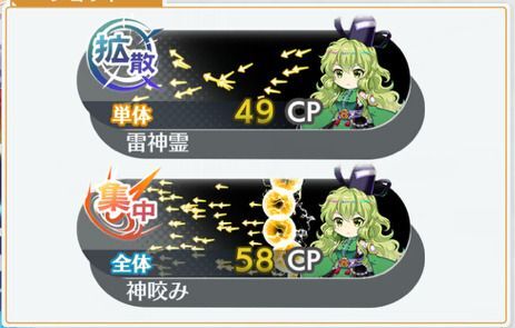 | 神代の雷神霊 ×2 | 木属性/陰気/単体 尖弾 命中率75% CRI率10% 必中弾 60%斬裂弾 弾性弾 相手単体の回避を1段階下げる(3T,100%) 人間の里&妖怪の山&魔法使い&巫女&命蓮寺特攻 威力:2.62 | 3 |