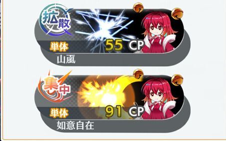 | 如意自在二器 ×1 | 水属性/陰気/単体 斬撃弾 命中率80% CRI率10% 50%斬裂弾 人間&異変解決者&付喪神&騒霊&人間の里特攻 威力:10.23 | 1 |