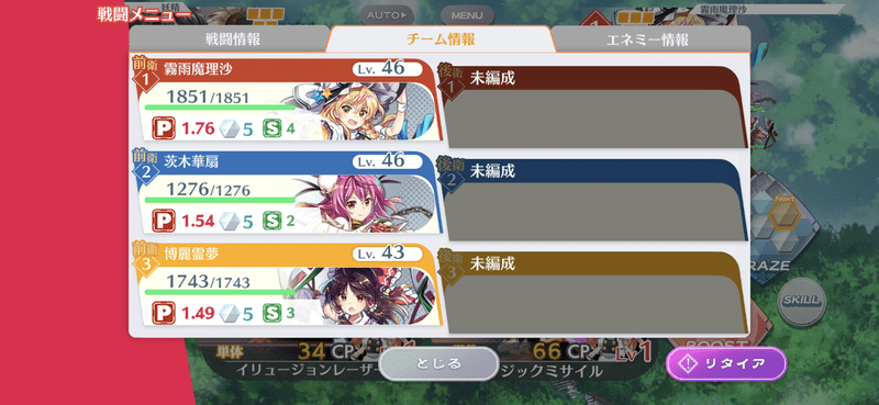戦闘中に味方キャラの属性を確認したい際は、戦闘メニューのチーム情報から確認する事が出来ます。