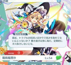 | マスタースパーク弾×2 | 無属性/陽気/全体 レーザー弾 命中率75% CRI率5% 威力:8.78 転生系譜:10.98 |
