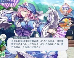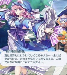 | 西行寺幽々子よ。白玉楼の主、冥界に住む亡霊の管理者。これでも風流な亡霊なのよ。楽しいことや賑やかなことがあったら是非誘ってね。それと、紫を通して貴方のことも効いているから、困ったことがあれば相談にのってあげるわ。死人に口アリ、おしゃべりは大好きなのよ。 | |
