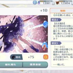 | 限凸後特性 | 装備スペカの斬撃の威力を50%アップ(1T) 装備スペカ使用時に命中を2段階アップ(1T) |