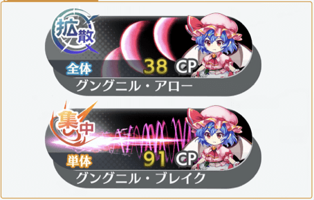 | グングニルB・血 ×2 | 水属性/陰気/全体 尖弾 命中率77% CRI率13% 人間&妹&並行世界&黒幕(LW)特攻 威力:6.21 | |