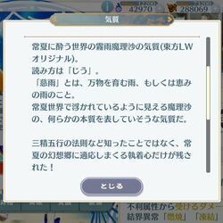 | 常夏に酔う世界の霧雨魔理沙の気質(東方LWオリジナル)。 読み方は「じう」。 「慈雨」とは、万物を育む雨、もしくは恵みの雨のこと。 常夏世界で浮かれているように見える魔理沙の、何らかの本質を表していそうな気質だ。 三精五行の法則など知ったことではなく、常夏の幻想郷に適応しまくる執着心だけが残された! 日差しなんてへっちゃらだぜ。(日精に強い) 星砂ってかわいいよなあ。(星精に強い) ついでに霊夢対策もしておくか。(木行に強い) でもせっかくのキレイな水着が、砂で汚れないように気をつけなきゃな。(土行に弱い) 水着を躊躇なく砂まみれにする霊夢を見つつ。 魔理沙はそんなことを思うのだった。 | |