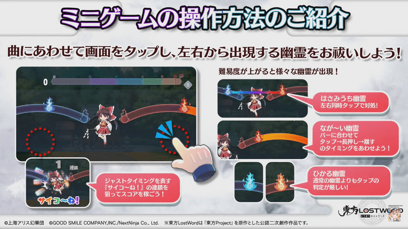 霊夢のお祓い大作戦は、レーンを流れて来る幽霊をタップしてプレイする音ゲーです。