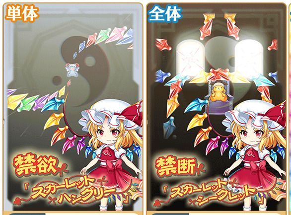 | スカーレットコミュニティ ×2 | 星属性/陰気/全体 尖弾 命中率80% CRI率10% 125%硬質弾 人形&人間&紅魔館&並行存在&黒幕(LW)特攻 威力:14.73 | |
