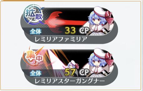 | 赤色の吸血鬼幻想 ×4 | 月属性/陰気/全体 エネルギー弾 命中率80% CRI率10% 最大5%吸収弾 妖怪&霊魂特攻 威力:3.27 | |