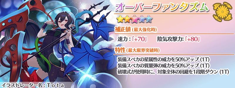 | 超浄水流 ×2 | 星属性/陰気/全体 レーザー弾 命中率69% CRI率25% 最大80%吸収弾 霊魂&アンデッド&幽霊&亡霊&地獄&冥界&後戸の国特攻 威力:6.26 | 3 |