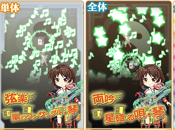 | 琴ノーツB ×2 | 木属性/陽気/単体 エネルギー弾 命中率80% CRI率10% 相手単体の陽防を1段階下げる(3T,100%) 幽霊&雷&機械&音楽家&エンジニア特攻 威力:3.68 | 1 |