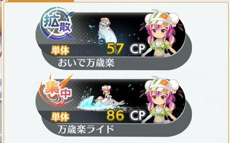 | おいで万歳楽 ×5 | 日属性/陽気/単体 肉弾 命中率80% CRI率10% 必中弾 80%斬裂弾 自身の陽攻を1段階上げる(3T,100%) 夏&水着&水棲&付喪神&天人&小人特攻 威力:4.30 | 0 |