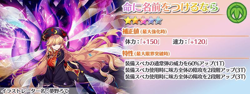 | 300 無名の弾幕 ×1 | 無属性/陰気/全体 通常弾 命中率80% CRI率10% 150%斬裂弾 150%硬質弾 閃光弾 幻想郷&月の民&地獄&並行存在&黒幕(LW)特攻 威力:39.27 | 3 |