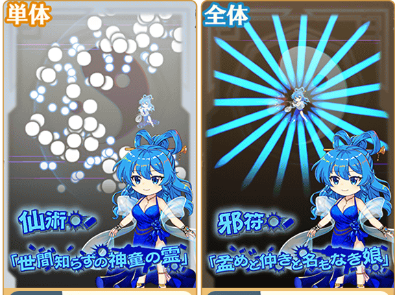 | 全体攻撃 【攻撃】水属性必中斬裂陽防低下各種特攻弾 【弾幕構成】陽気寄り 【ブースト追加】水属性弾性弾/金属性陽攻上昇弾/水属性弾性斬裂各種特攻弾/金属性弾/水属性弾性斬裂各種特攻弾 | |