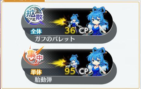 | 単体攻撃 【攻撃】水属性斬裂速力上昇各種特攻弾 【弾幕構成】陽気寄り 【ブースト追加】金属性命中上昇弾/水属性弾性斬裂CRI回避低下各種特攻弾/金属性弾/水属性弾性各種特攻弾 | |
