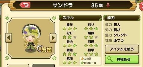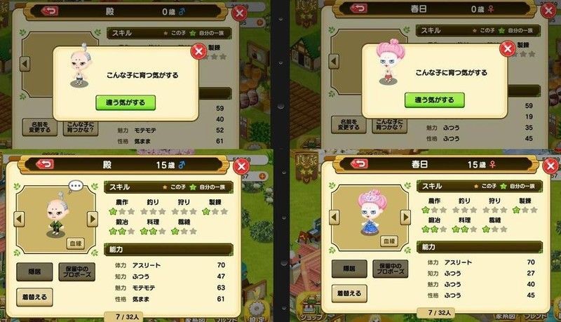 一例として、一族に農作☆3持ちの方がいて、「体力80知力80、農作経験無し」の子で「パクチー×8」を栽培すると、作業終了時点で農作スキルが「☆2までわずか」に上がる。