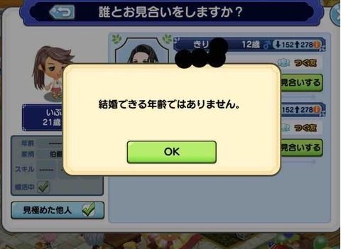 現在は17歳以下と10歳以下で〔お見合いをする〕を選んでも、結婚できる年齢ではありませんとエラー表示になる仕様です。