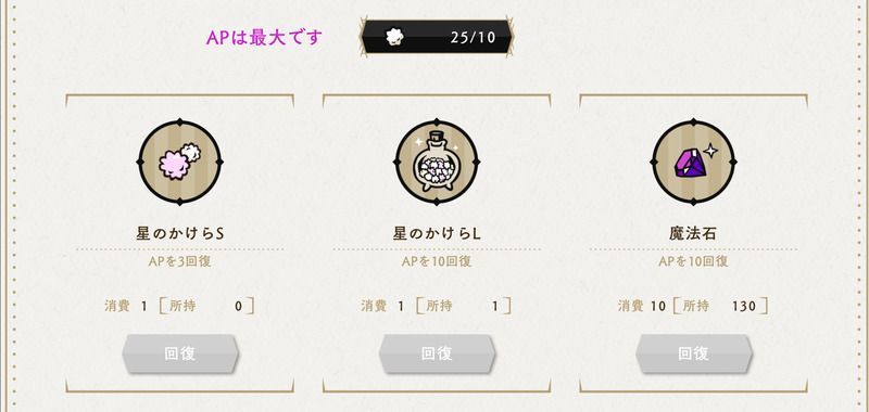 APが無くなってしまったら魔法石で回復することができます。ただし、魔法石はできればガチャに使ったほうが良いので、キャラが揃ってないうちはAP回復に使うのは控えておきましょう。
